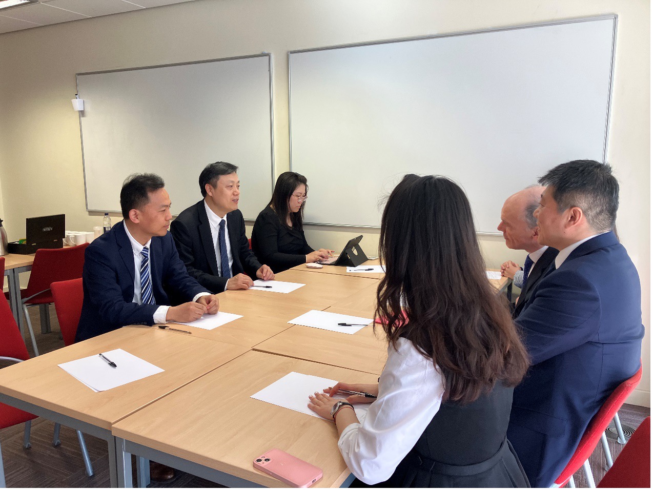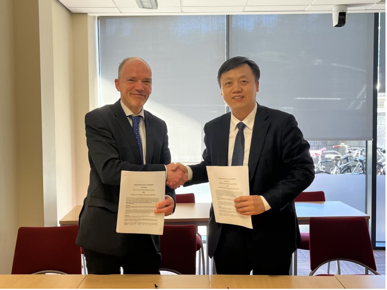 在英期间,太阳集团官网代表团与杜伦大学太阳集团官网就双方联合培养研究生事宜进行了详细探讨,确认了关于“1+1+1”双硕士项目的提名流程、录取人数、学分置换、奖学金设置、学位授予等事项。双方进一步讨论了协议签署后的实施方案,包括在教师互访、学生交流、联合科研等方面展开深度合作,共同推动涉外法治人才培养的国际化进程。周长军代表太阳集团官网、Volker Roeben教授代表杜伦大学太阳集团官网签署了《太阳集团官网与杜伦大学太阳集团官网合作备忘录》。